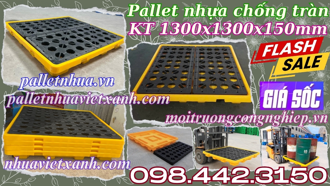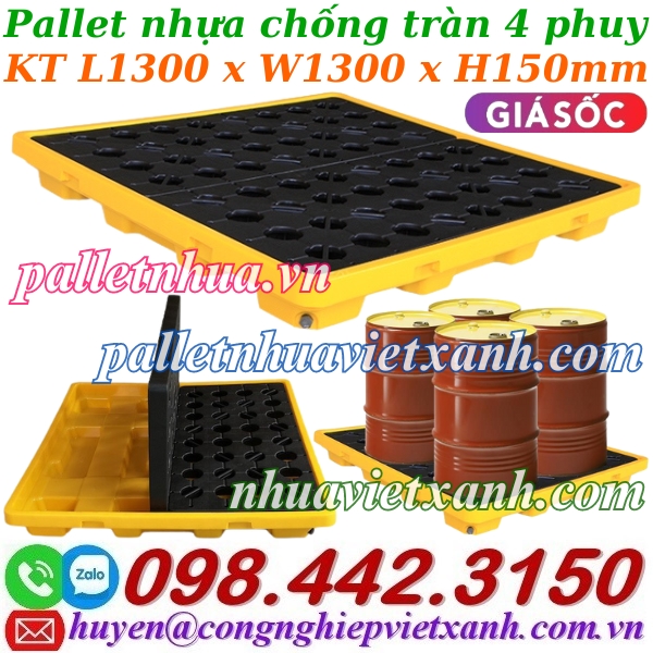 - Pallet nhựa chống tràn 4 phuy - khay nhựa chống tràn 4 phuy kích thước 1300x1300x150mm đáp ứng các quy định về ngăn tràn cho tối đa 4 thùng phuy và tuân thủ các yêu cầu về ngăn tràn của SPCC và EPA.