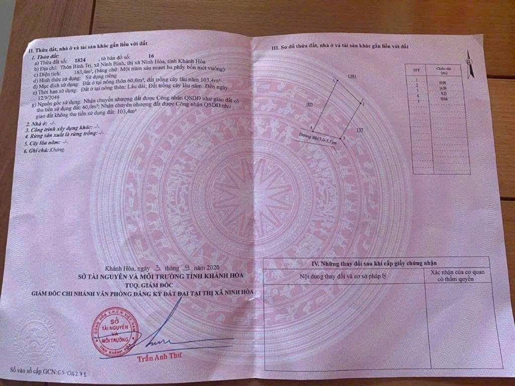 Chính chủ gửi bán lô đất full thổ cư Thôn Bình Trị - Xã Ninh Bình- Thị xã Ninh Hòa - Khánh Hòa- Diện tích: 163,4 m²- Đường bê tông 5m - Khu dân cư hiện hữu , Thích hợp đầu tư xây nhà hoặc Tích lũy sinh lời - Giá Chốt : 620tr Liên hệ: 0776262077
