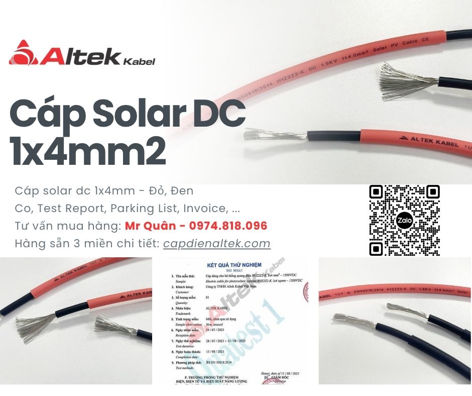 Cáp solar DC 1x4mm² thương hiệu Altek Kabel là dòng cáp chuyên dụng cho hệ thống điện mặt