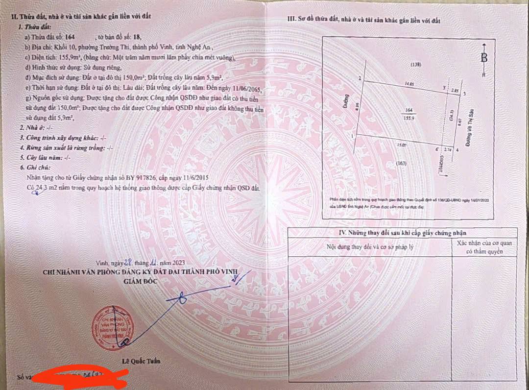 ✅ BÁN ĐẤT 156m2 MẶT ĐƯỜNG VÕ THỊ SÁU, PHƯỜNG TRƯỜNG THI, TP VINH