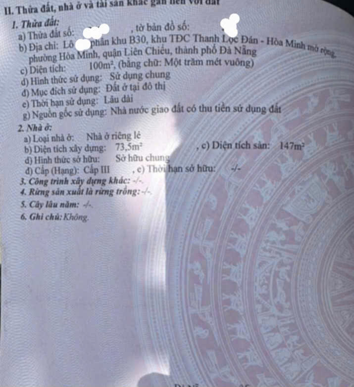 -Diện tích: 100 m² – Lô đất vuông vức, không vướng quy hoạch, tối ưu công năng sử dụng.-Ngang: 5 m – Mặt tiền thoáng, ... phù hợp mở cửa hàng, quán cà phê hoặc văn phòng công ty.-Nhà: 2 tầng, gồm 3 phòng ngủ, 2 wc – Kết cấu kiên cố, còn mới, có thể vào ở hoặc khai thác cho thuê ngay.-Đường trước nhà: 7.5 m, vỉa hè 4.5 m – Lòng đường rộng rãi, thuận tiện đỗ xe và kinh doanh buôn bán.Giá: 7.18 tỷ – Mức giá cạnh tranh so với khu vực trung tâm Hòa Minh, tiềm năng sinh lời cao.