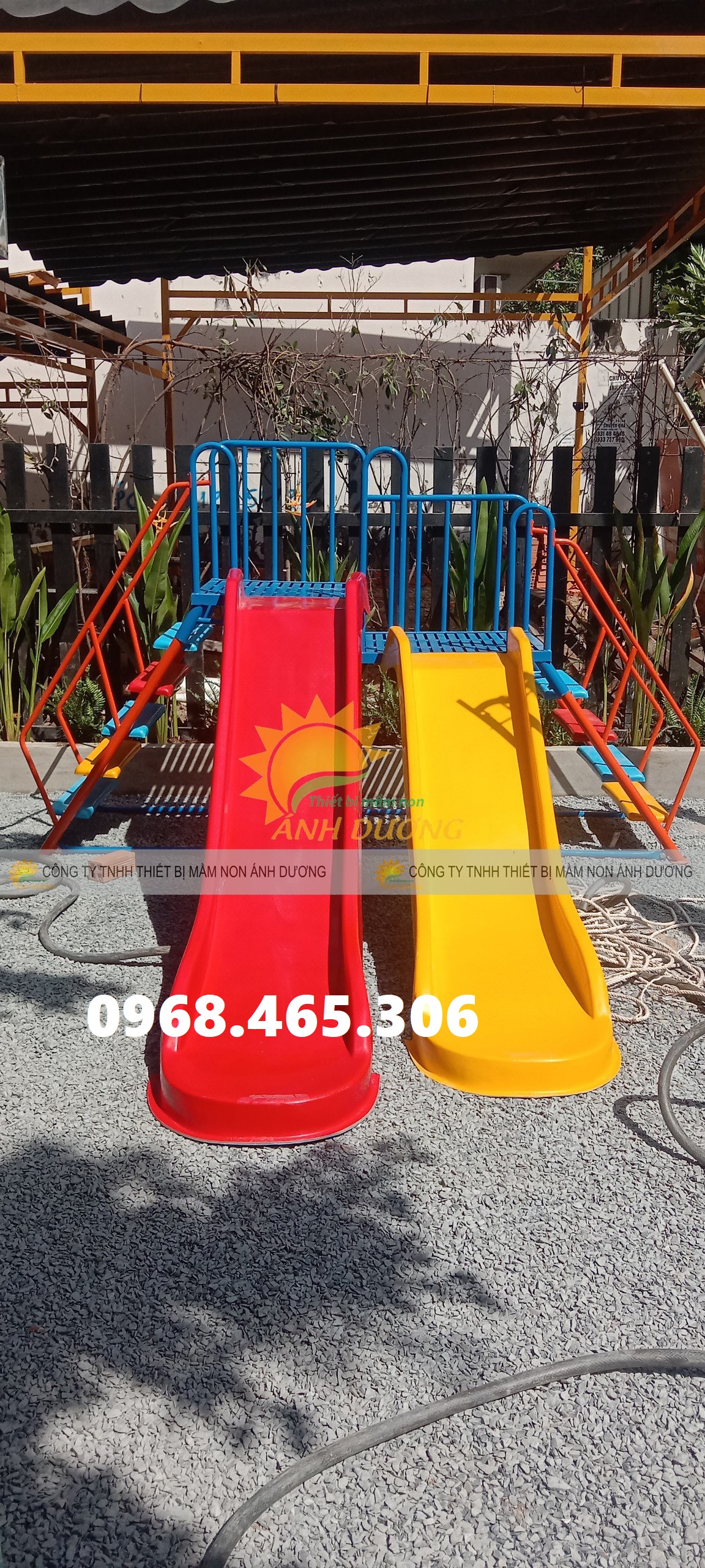 Cầu trượt được phủ lớp sơn màu sáng bóng, chống phai màu, có độ bền tốt, thiết kế bề mặt láng