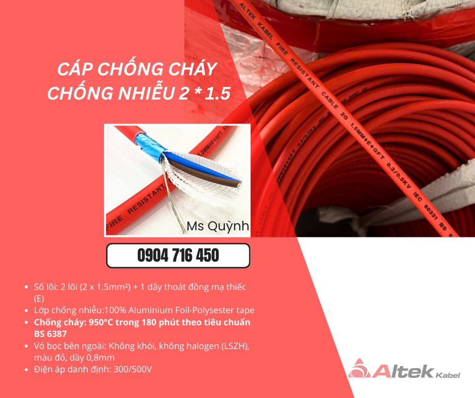 Cáp Chống Cháy Chống Nhiễu 2x1.5mm2 Altek Kabel