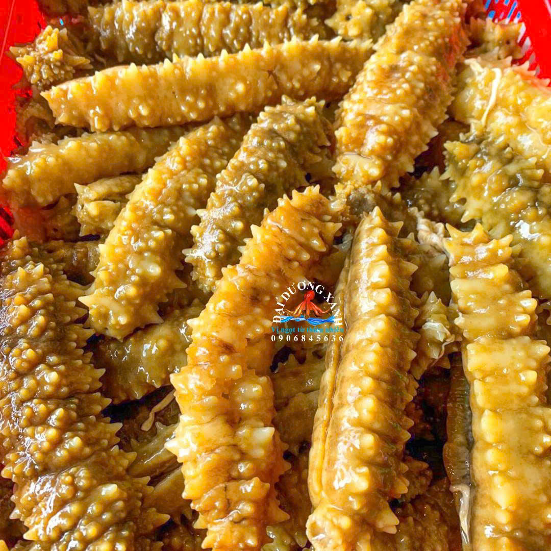 nhận biết dễ nhất của hải sâm gai vàng là lớp da dày, nhiều gai nhỏ màu ... vàng nâu đặc trưng, thịt