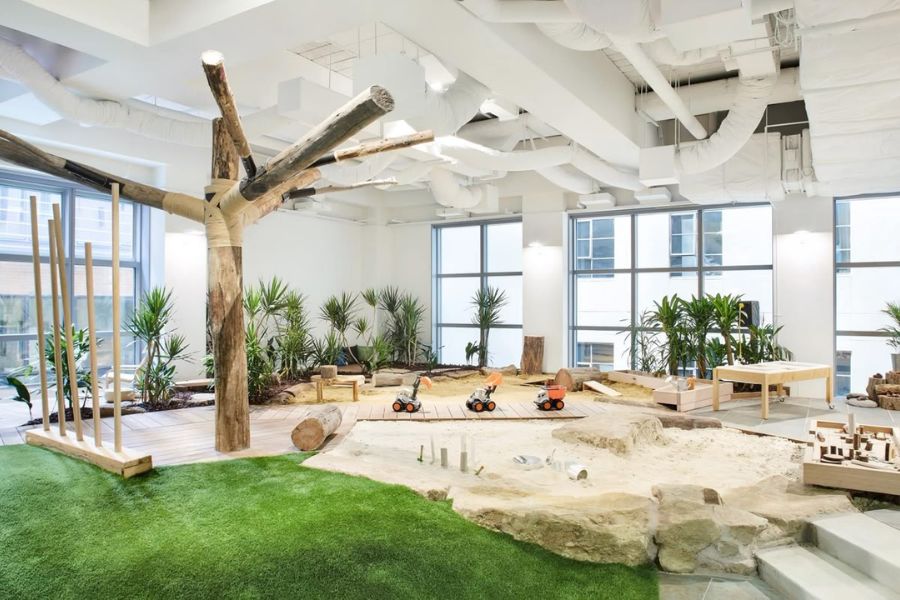 của trẻ. Sàn nhà thường được xử lý chống trơn trượt, sử dụng thảm mềm hoặc vật liệu đàn hồi để