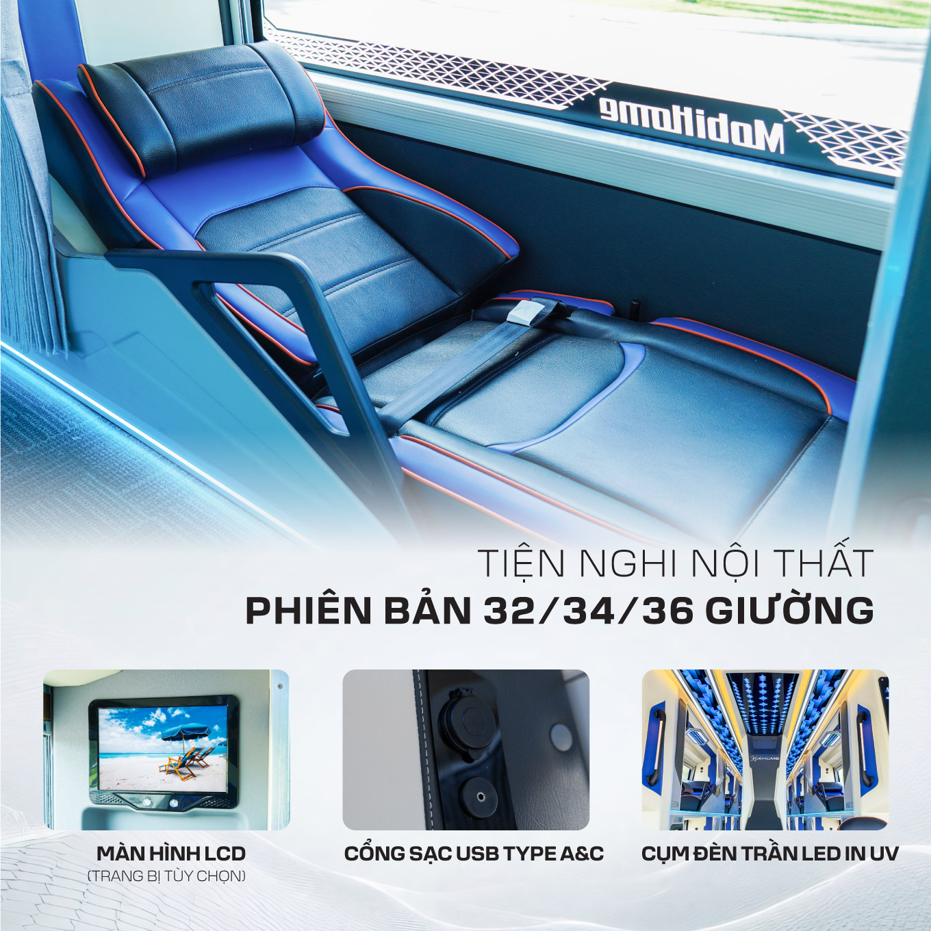 - Tiện nghi nội thất đẳng cấp: Giường nằm cao cấp, màn hình LCD, cổng sạc USB Type A & C và