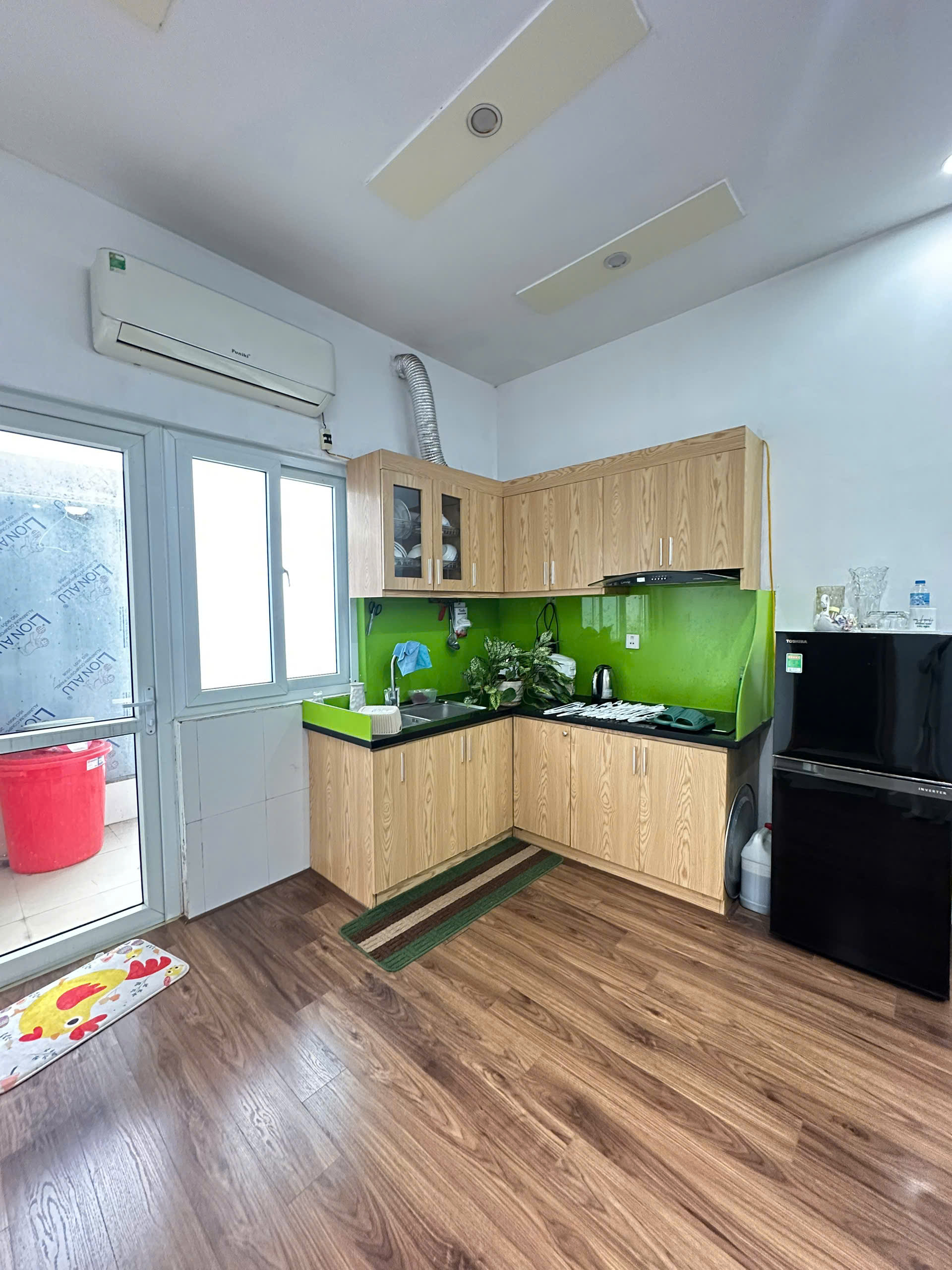 Nội thất căn hộ được trang bị: Sàn gỗ, trần thạch cao, hệ thống tủ bếp, hút mùi, quạt trần, điều hoà,