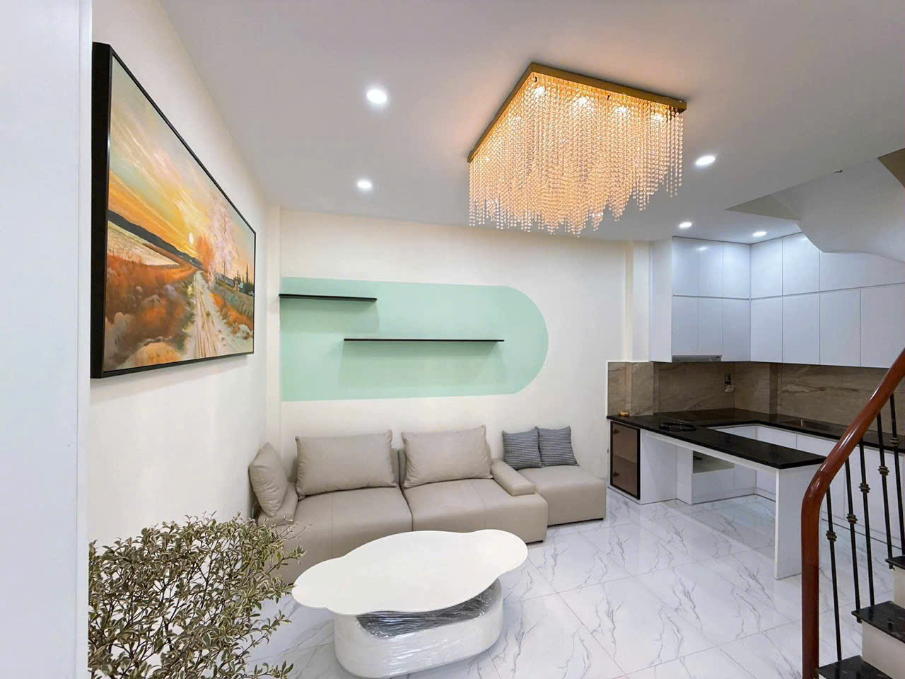 1️⃣ Tầng 1: Phòng khách sang trọng, bếp đá granite sáng bóng, trang bị nội thất hiện đại, đủ sức