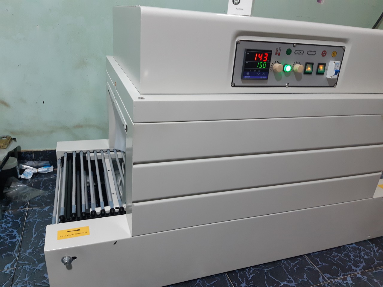 Sử dụng: công nhân chụp màng co vào sản phẩm và đưa sản phẩm vào máy chạy thao băng tải
