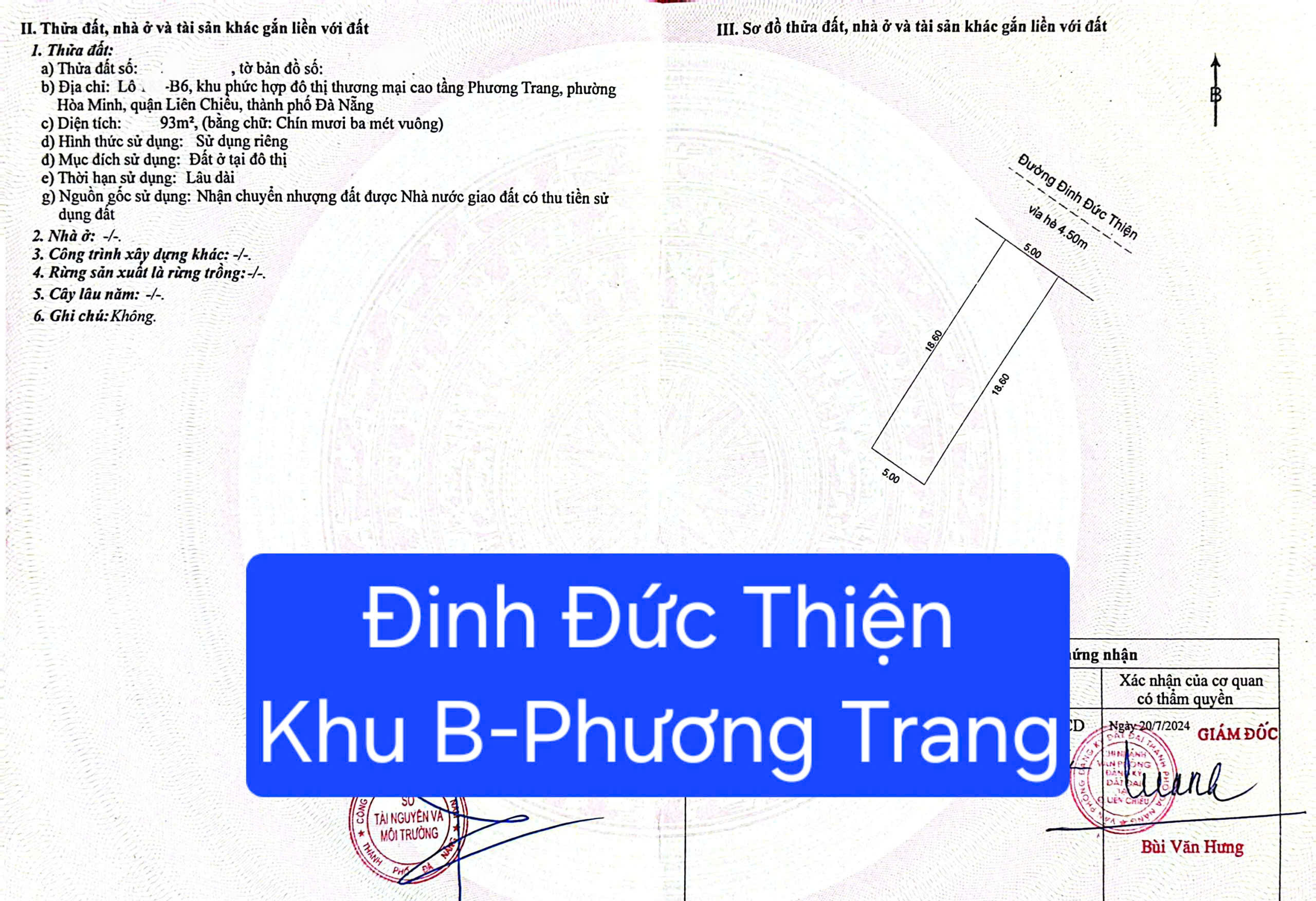BÁN ĐẤT ĐƯỜNG 7,5M ĐINH ĐỨC THIỆN - Khu B Phương Trang)-P. Hòa Khánh, TP Đà Nẵng-DT : 93m2 (5x18,6)m-Đường 7m5 , lề 4,5m -Vị trí đẹp gần đầu đường Đinh Đức Thiện thuộc Khu B Nguyễn Sinh Sắc ,xung quanh toàn nhà đẹp , cạnh trung tâm hành chính quận, an ninh tốt, dân trí cao, gần biển khí hậu mát mẻ , điện âm Gía: 6 tỷ 800