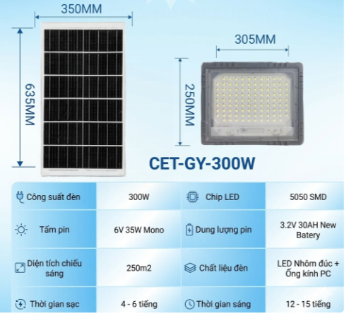 Kích thước đèn: 300x250mm, tấm pin: 630x350mm thiết kế nhỏ gọn, dễ lắp