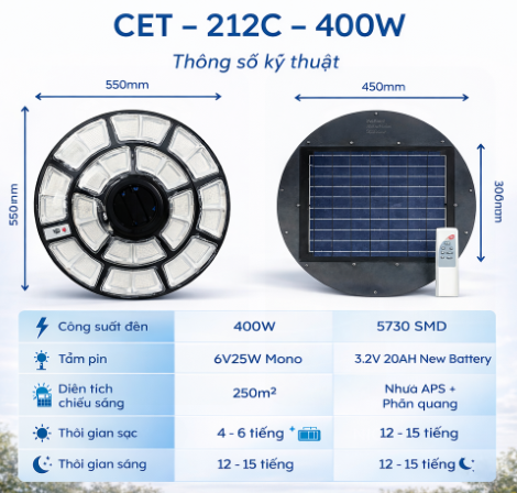 Kích thước: Đèn: 550 mmX550mm, Tấm Pin: 450 mmX450mm