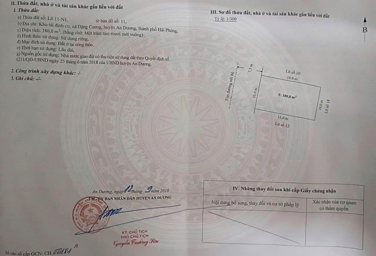 Bán đất ngang 10m trục chính TĐC Thành Công, Đặng Cương, An Dương- Diện tích: 180m2 ngang 10m- Hướng: Tây Bắc- Đường trục chính trải nhựa 9m vỉa hè 3m.- Sổ hồng chính chủ- Vị trí tuyến 2 đường mương An Kim Hải. Đường to rộng rãi.- Thửa đất vuông vắn không lỗi lầm, giá thì lại rẻ khu vực, diện tích to, mặt tiền rộng xây villa, biệt thự thì hết ý.- Giá: 4,64 tỷ (có ra lộc)LH E.Văn: 0904.621.885 (Zalo/SĐT) để biết thêm thông tin chi tiết.