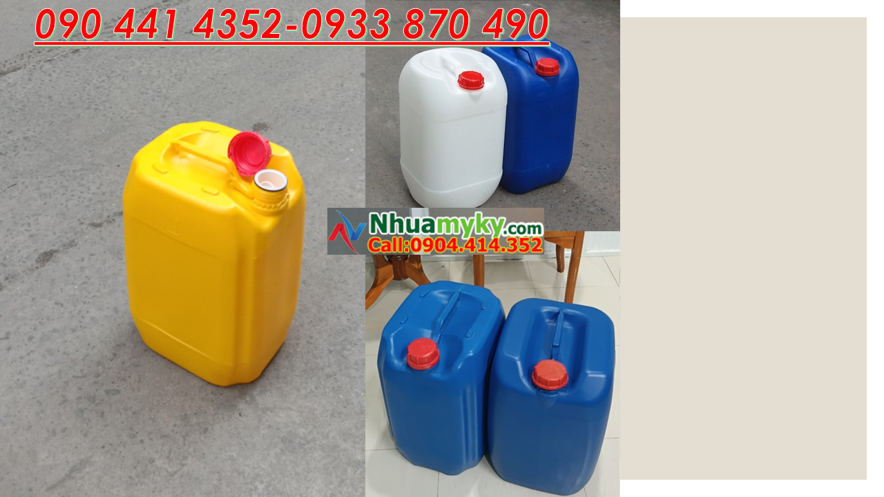 +Can 20 lít có màu sắc: vàng, trắng, đỏ, lá, dương, đen, xám...và phía trên có 4 nút chống trượt