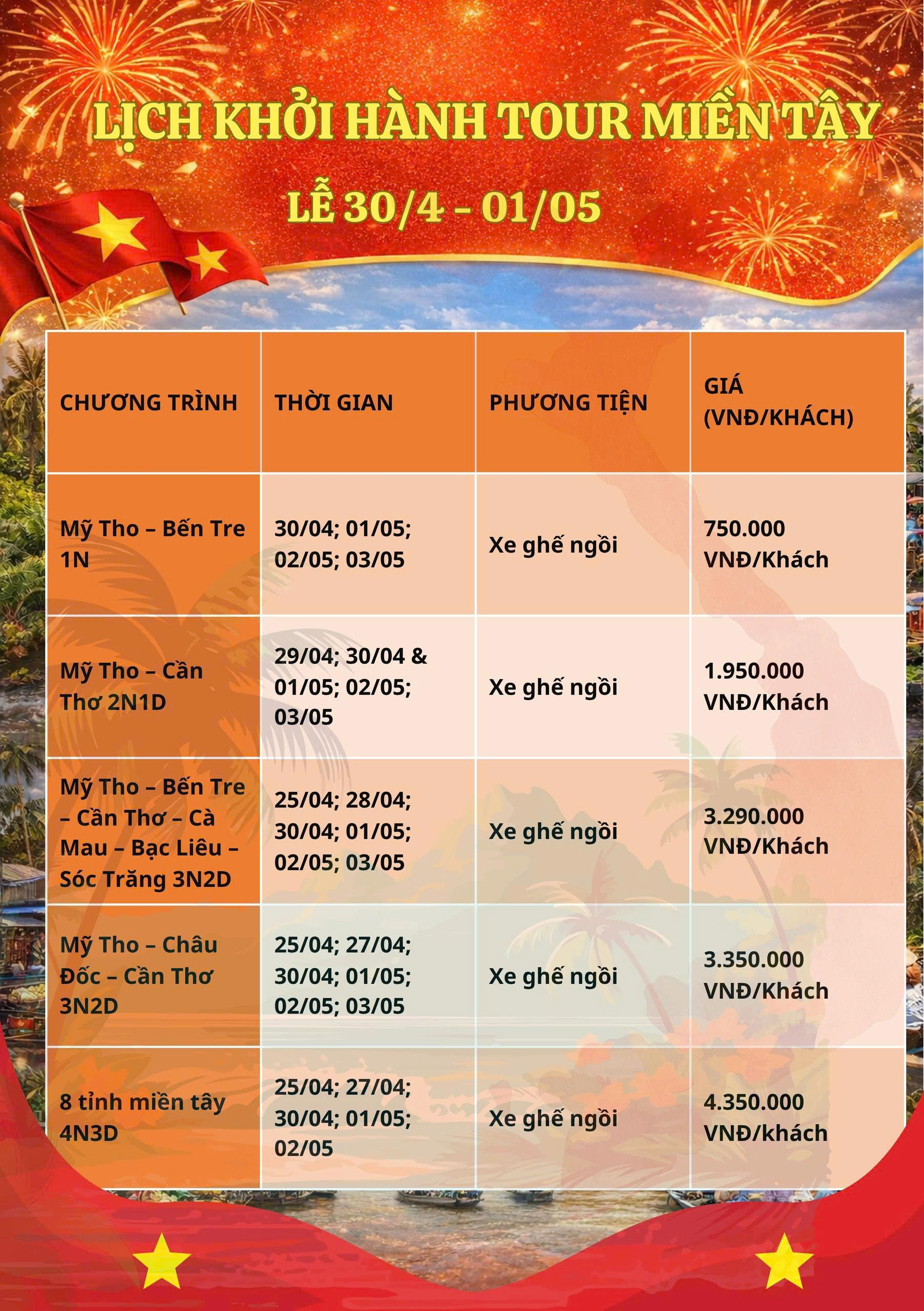 🌴 LỊCH KHỞI HÀNH TOUR MIỀN TÂY LỄ 30/04 – 01/05 🌴🇻🇳